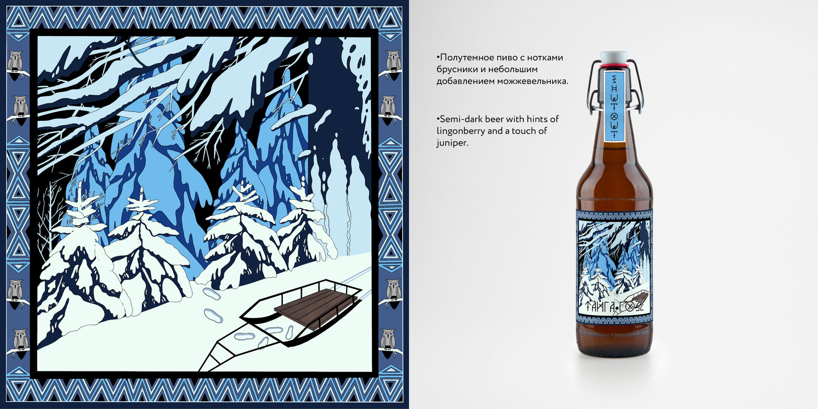 Иллюстрации для сибирской крафтовой пивоварни "Shutout" были созданы в процессе изучения народного фольклора Сибири, на их визуальный ряд повлиял великий русский художник Иван Яковлевич Билибин.